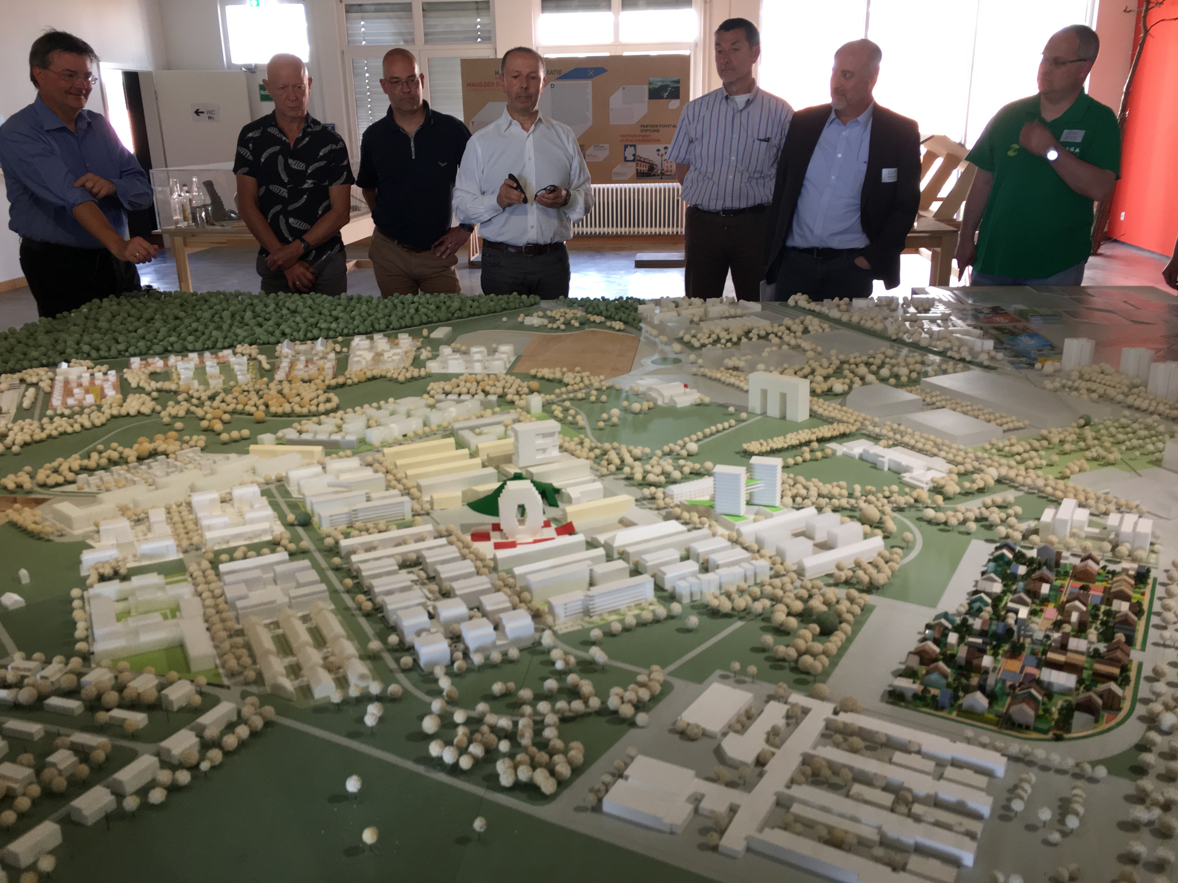 Heinz Hanen von der evohaus GmbH begrüßte im historischen ZEITSTROM-Haus im FRANKLIN Mannheim 30 Teilnehmer des ersten BRENNPUNKTs on Tour und stellte anhand eines Modells das FRANKLIN-Quartier vor, auf dem die evohaus GmbH 326 Wohnheiten mit hoher Energieeffizienz (u.a. eine PV-Anlage mit 875 kWp und einem 300 kWh Batteriespeicher) errichtet.